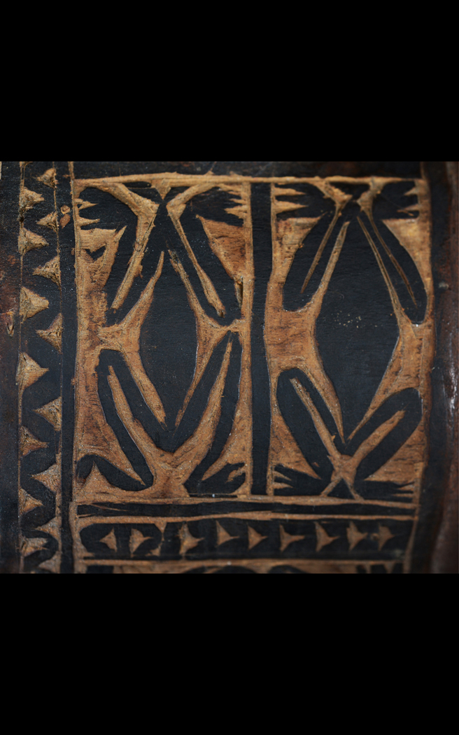 "The drums of this region are distinguished from the Huon Gulf variety primarily by the handles. These end in a loop, said to represent a snake,whereas the handles of the Huon Gulf drums are perfectly plain. Also, the Astrolabe drums are tubular in shape and very seldom have the semblance of a waist. On the opposite side of the handle there is again the highly carved open- work projection, sometimes much longer than the handle. It is here meant to represent a stylized lizard or snake. No handle bands are present, but a design is incised on two or more raised surfaces, which encircle the centre of the drum.These are always band- like and never jaw shaped. The tympanum is again of Varanus skin, glued on.The open end is left round, and unornamented."