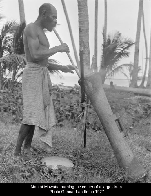 It is also common practice at Mawatta to remodel imported Budji drums slightly by obliterating the original ornamentation and making the woodwork thinner by scraping them outside and inside (thereby improving the sound), then incising fresh ornamentation.