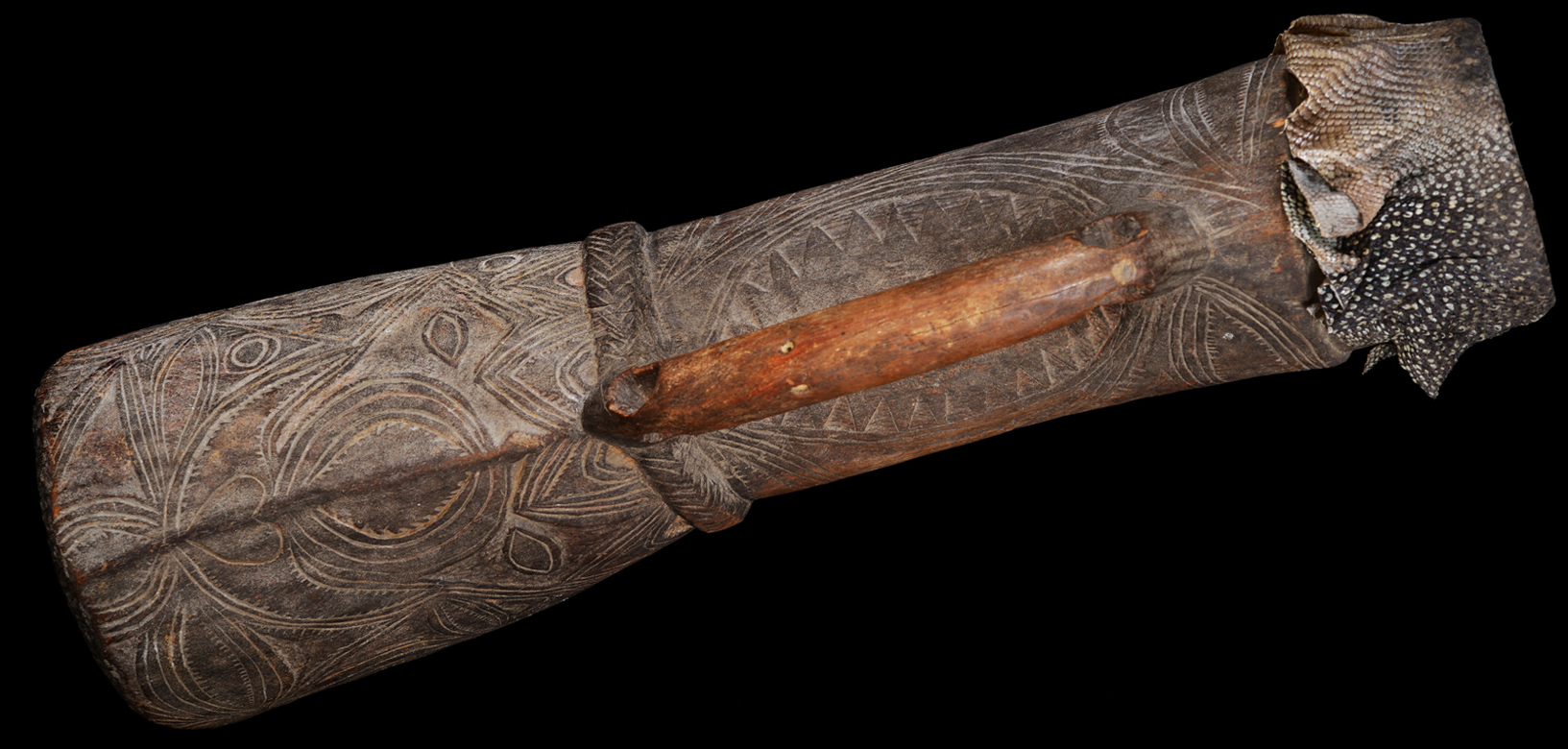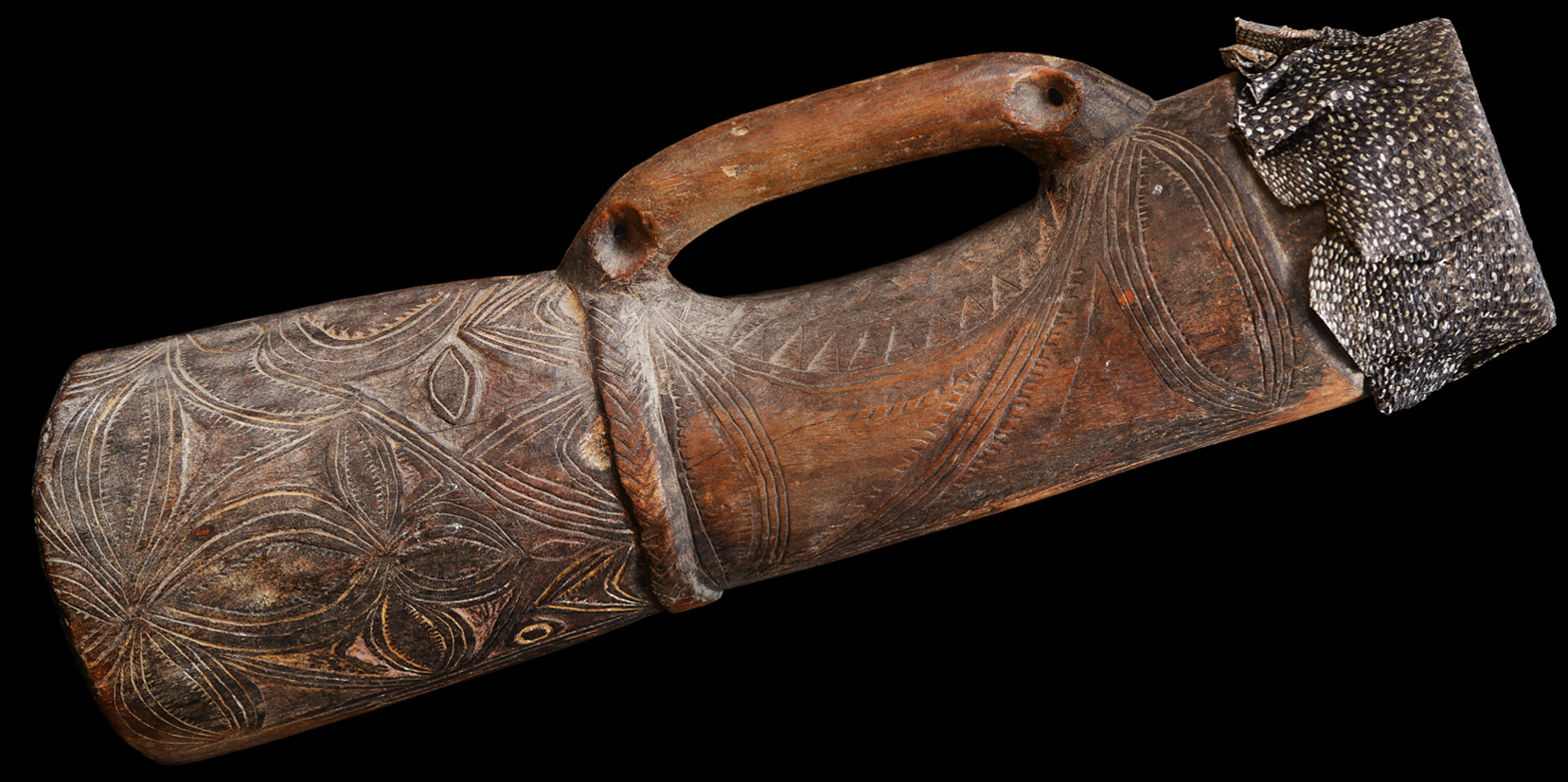 This pre-contact and stone-carved handdrum comes from the Kwanga area to the southwest of the Abelam and north of the Sepik River.