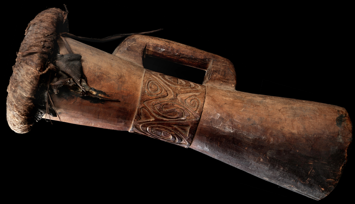 They differ from the Humboldt Bay drums, however, in their decoration. This includes the series of spiral motifs which are so characteristic of Lake Sentani art."