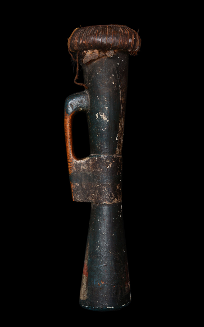 As far as we know two types of drum were in use in the Lake Sentani region : one broad and massive, in the shape of a cylinder, cone or hour-glass ; the other long and narrow, with a slight central constriction.