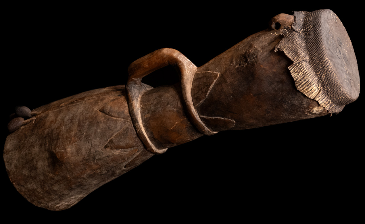 Held in one hand while the other is used to strike the lizard-skin drum head.