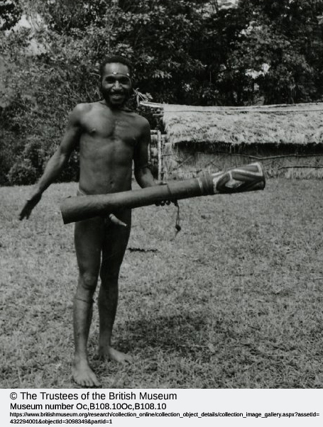 "(...)among Telefol speakers and other Min groups, males in their twenties learn how to drum at the fifth of seven stages of initiation, called wotban. While the drum (wot) itself is not secret, knowledge to play it is learned through ritual, where the relation of the instrument, its