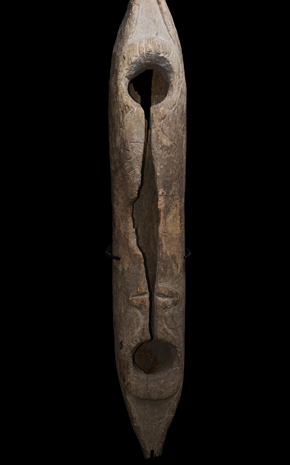 The garamut drums from this area are of an unique canoe shaped form and can be played in an upright or in a horizontal position.